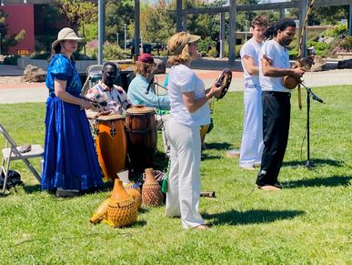 Participants join in with music and dance. Bobbie plays percussion with musicians.